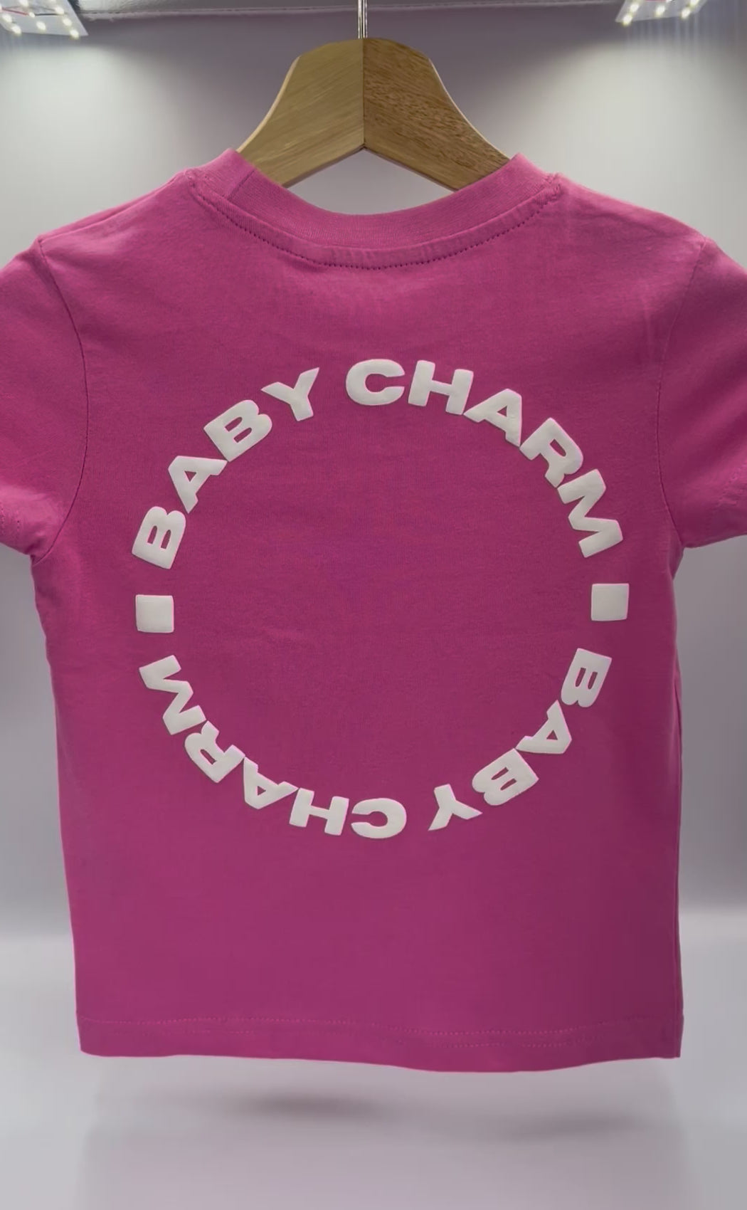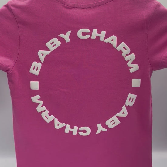 Introducing our Baby & Toddler Pink T-Shirt, crafted from 100% organic cotton to ensure maximum comfort and safety for your little charms delicate skin. This soft, breathable t-shirt features our reflective logo on the left front, adding a touch of style and safety. The back of the t-shirt showcases "Baby Charm" written in white puff vinyl, artistically arranged in a circle, adding a playful and charming detail. Perfect for everyday wear, this t-shirt combines quality, comfort, and a unique design to make your child shine.